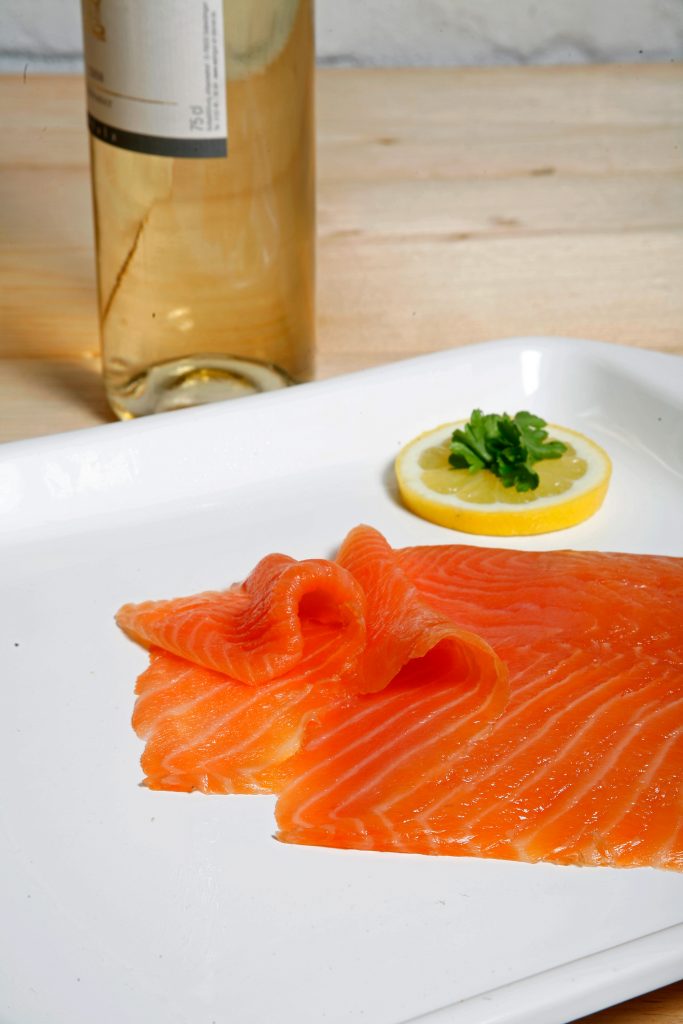 Wir verwenden ausschließlich Lachse der Sorte Salmo salar. Die Fische werden perfekt getrimmt wobei das Muskeldreieck, der Bauchlappen und die Silberhaut entfernt werden.